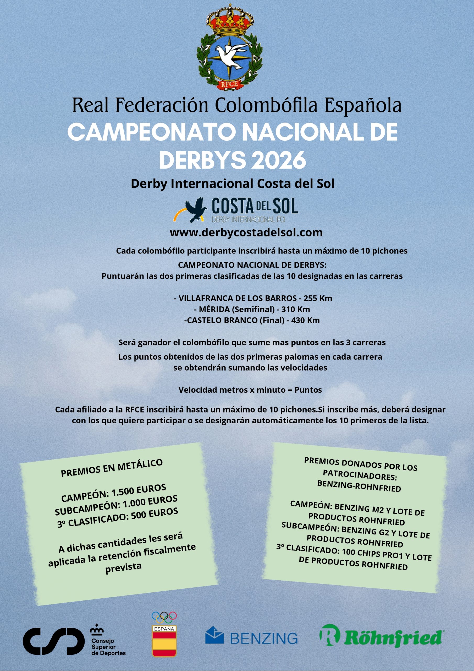 Para una mayor participación de los mismos, cada Derby deberá inscribir todas las palomas que sirvan para el Campeonato Nacional siempre y cuando el participante tenga licencia federativa nacional.