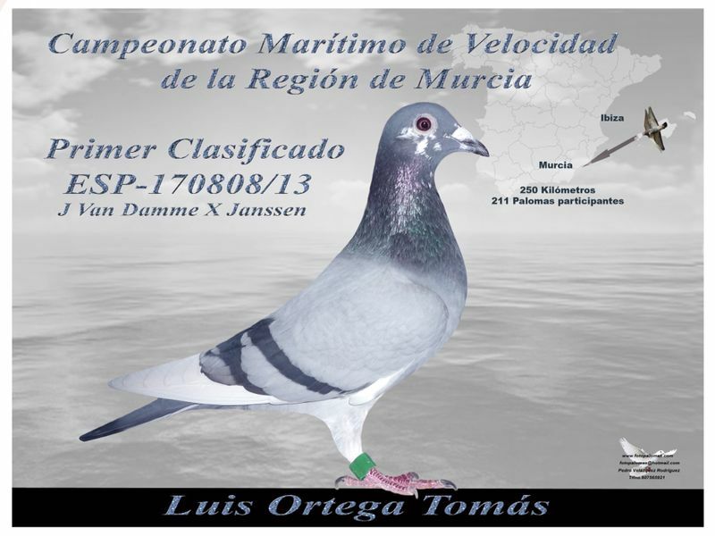 – Es un pichón macho. El padre el puro J. Van Damme y la madre Janssen en varias generaciones ya probadas en Murcia, en mi palomar. El resultado no es ninguna casualidad. Van Damme es un especialista en velocidad que ya en el Derby Huerta de Murcia ganó metiendo 5 palomas entre las 15 primeras. Y la madre es una viajera mía extraordinaria así como sus ascendentes y descendientes. Lo más rápido de mi casa. Cruce rápido con rápido.