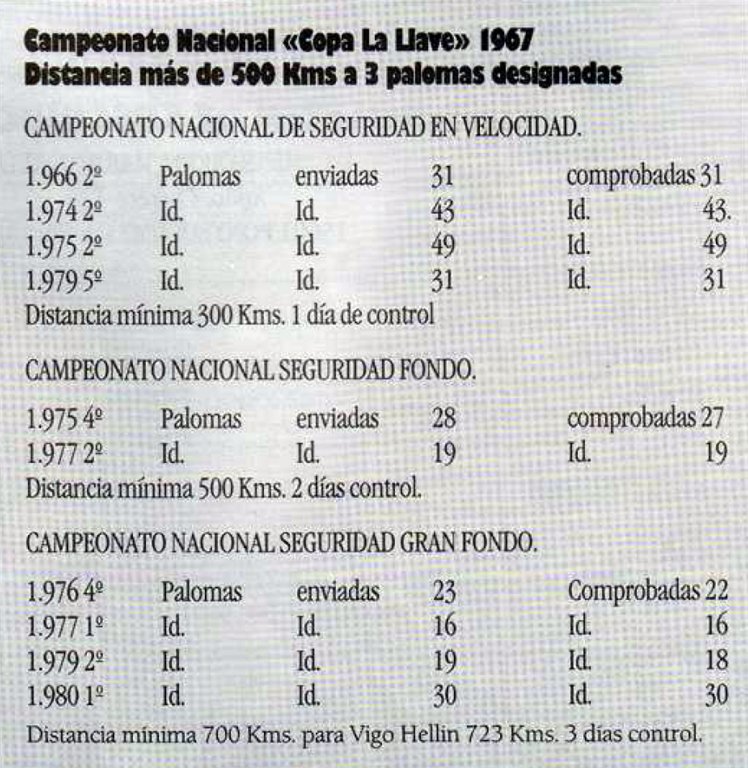 En su palmarés deportivo figuran muchos campeonatos de ámbito social, catalán y estatal y ha participado en diversas Olimpiadas Internacionales Colombófilas.