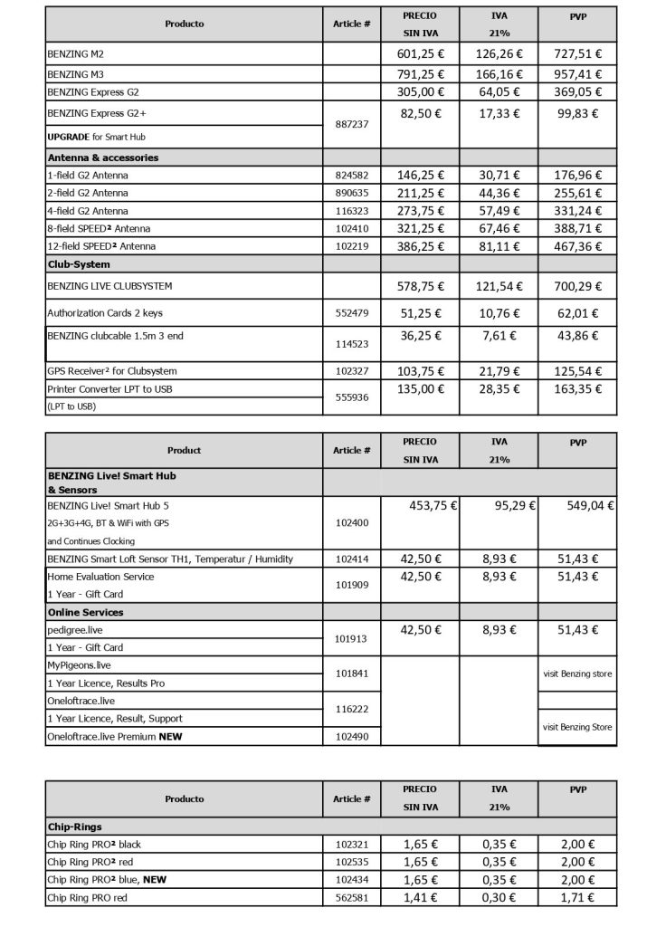 PRECIOS ARTÍCULOS BENZING 2026 – PENÍNSULA Y BALEARES